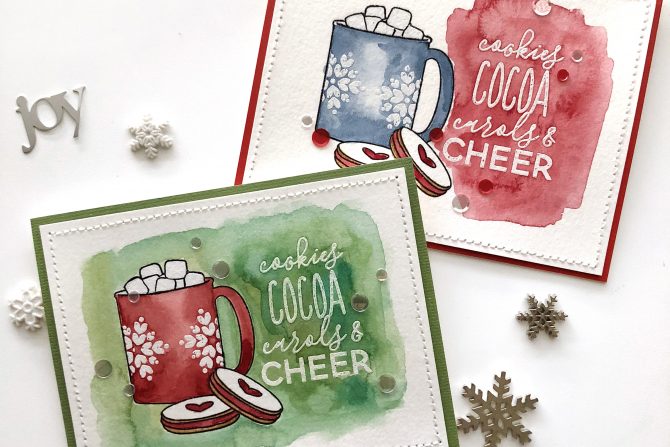 Hello, hi! How is your Monday going? If you’re needing a pick-me-up already, a mug of cocoa and a cookie perhaps, well….I can’t provide that exactly, but I do have a couple of cute cards that might come close?