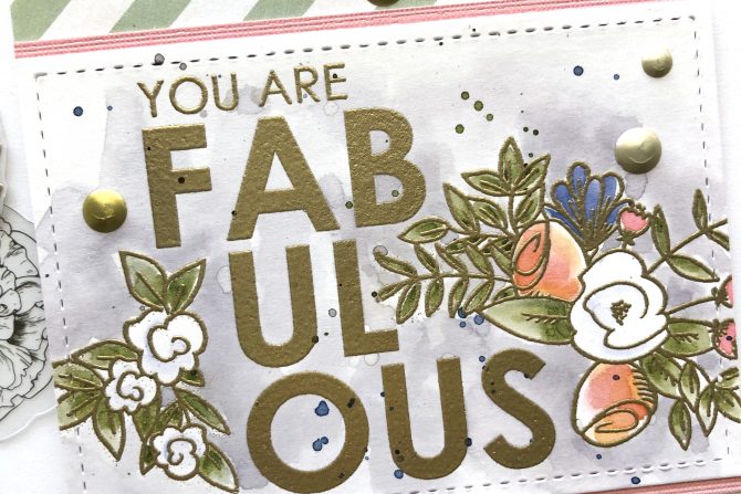 For the next two cards, I continued to use the florals from the Hello & Thanks stamp set, this time pairing them with the Fierce and Fabulous stamp set. Only, I didn’t want the “fierce” and “amazing” part to be stamped, so I positioned the stamp on the MISTI door, covered with washi tape, the two words I didn’t want stamped, inked up the rest of the stamp, removed the washi tape and stamped down with the part I did want to see, the part that says “You are Fabulous”. It worked perfectly and I covered it with Gold embossing powder, to match the pair of floral images on either side of the word.
