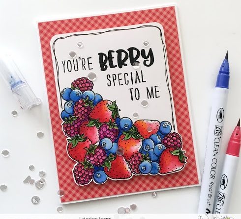 I used the Life is Good stamp set for all the fruit, the ABC’s set for the word BERRY, and the Mama Elephant Bella Letters for the rest of the sentiment.